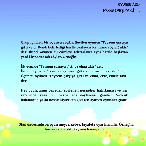 İkinci oyuncu "Teyzem çarşıya gitti ve elma, erik aldı." der.