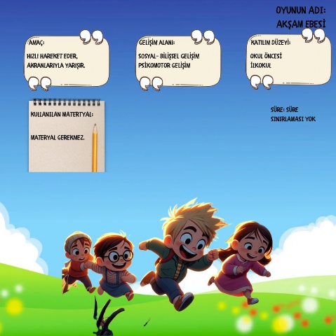 OYUNUN ADI: AKŞAM EBESİ amaç: gel ş m alanı: katılım düzey : Hızlı hareket eder, Sosyal- B l şsel Gel ş m OKUL ÖNCESİ Akranlarıyla yarışır. PSİKOMOTOR gel ş m İLKOKUL SÜRE: SÜRE kULLANILAN MATERTYAL: SINIRLAMASI YOK Materyal gerekmez.