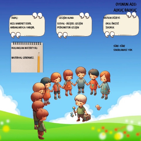 OYUNUN ADI: ALKUÇ BALKUÇ amaç: gel ş m alanı: katılım düzey : Hızlı hareket eder, Sosyal- B l şsel Gel ş m OKUL ÖNCESİ Akranlarıyla yarışır. PSİKOMOTOR gel ş m İLKOKUL SÜRE: SÜRE kULLANILAN MATERTYAL: SINIRLAMASI YOK Materyal gerekmez.