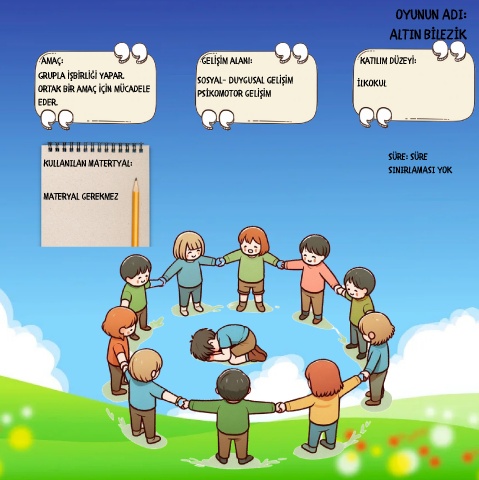 OYUNUN ADI: ALTIN BİLEZİK amaç: gel ş m alanı: katılım düzey : Grupla şb rl ğ yapar. Sosyal- Duygusal Gel ş m İLKOKUL Ortak b r amaç ç n mücadele PSİKOMOTOR gel ş m eder. SÜRE: SÜRE kULLANILAN MATERTYAL: SINIRLAMASI YOK Materyal gerekmez