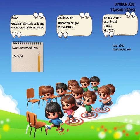 OYUNUN ADI: TAVŞAN YARIŞI amaç: gel ş m alanı: katılım düzey : OKUL ÖNCESİ Arkadaşlık l şk ler n gel şt r r. Ps komotor gel ş m Ps komotor gel ş m n destekler. Sosyal gel ş m İLKOKUL ORTAOKUL SÜRE: SÜRE kULLANILAN MATERTYAL: SINIRLAMASI YOK SANDALYE
