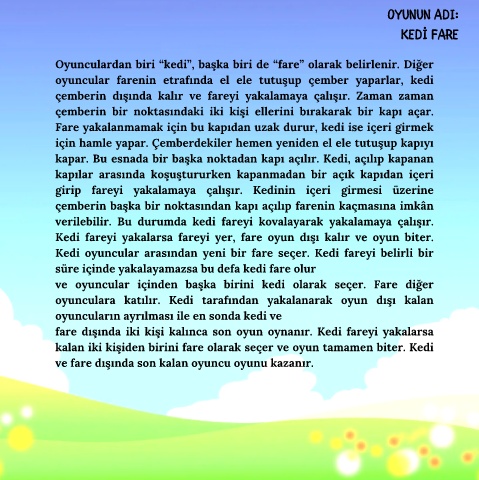 fare dışında iki kişi kalınca son oyun oynanır. Kedi fareyi yakalarsa