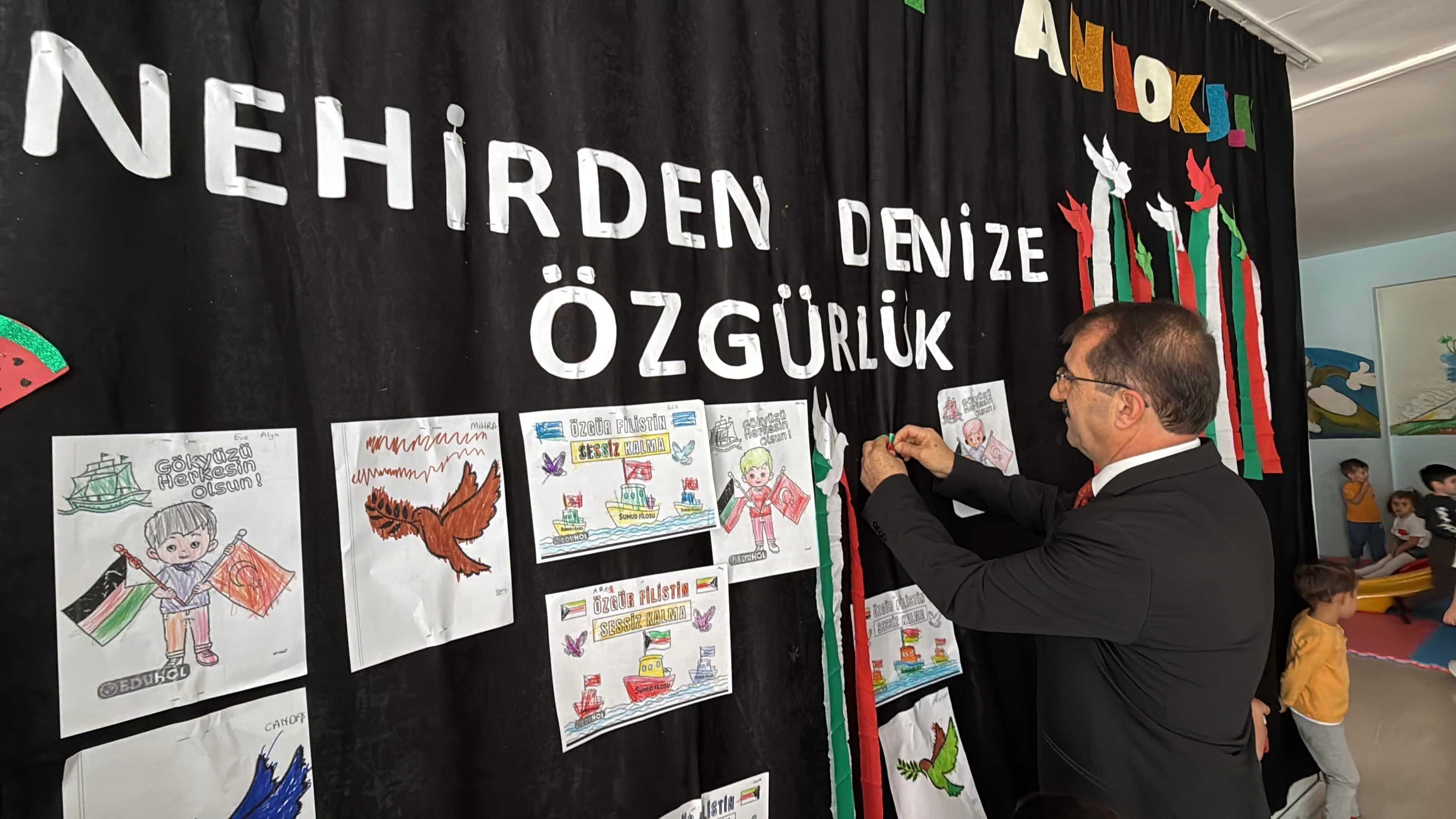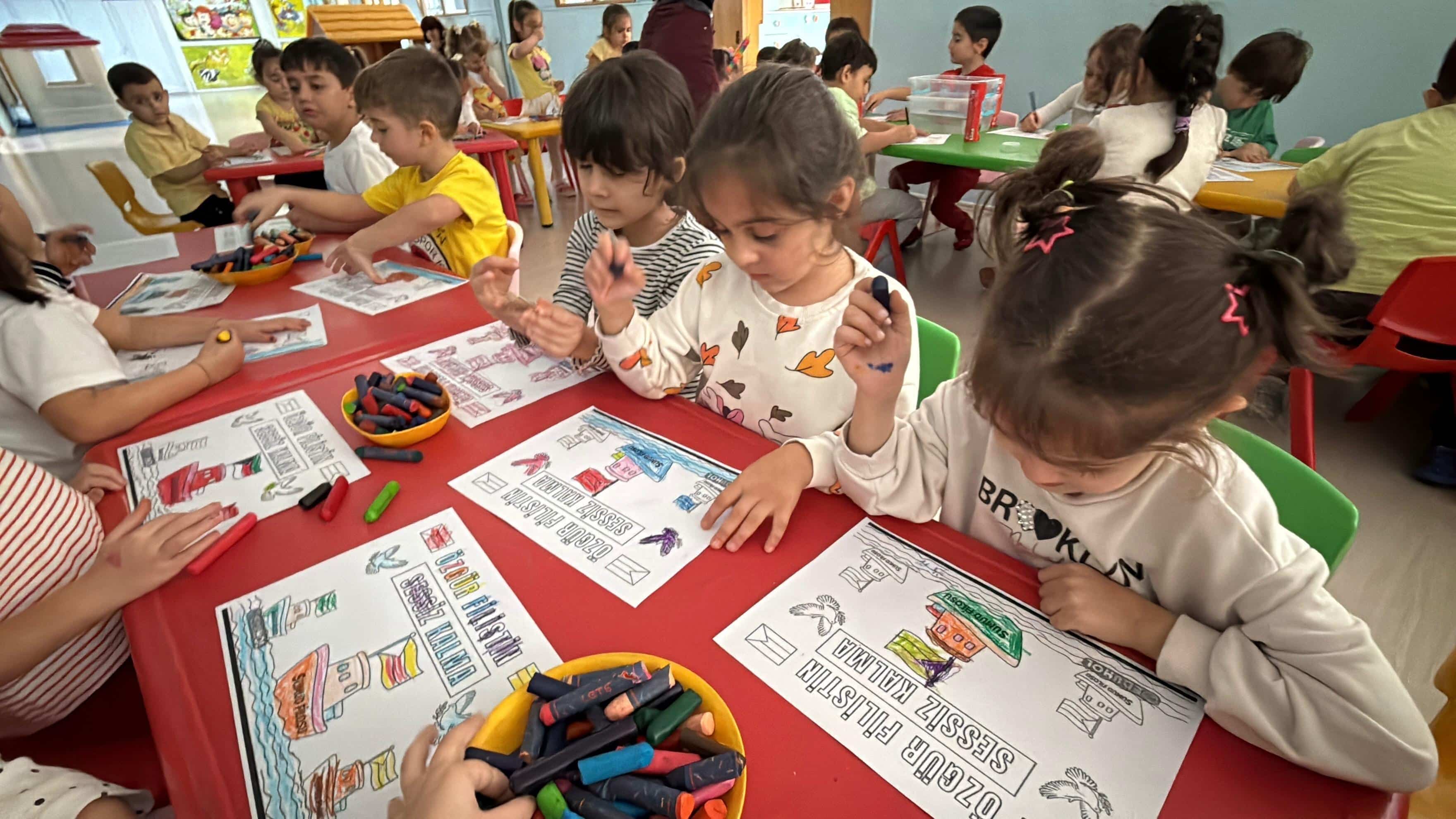 "Nehirden Denize Özgürlük" temalı etkinlikte minik öğrenciler, öğretmenleri rehberliğinde boyama çalışmaları yaparak Filistin'e destek mesajları verdi.